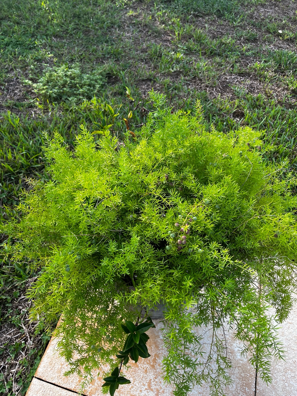 Description: Bushy ornamental with fine needle-like stems forming soft fronds. Produces small white flowers and red berries.