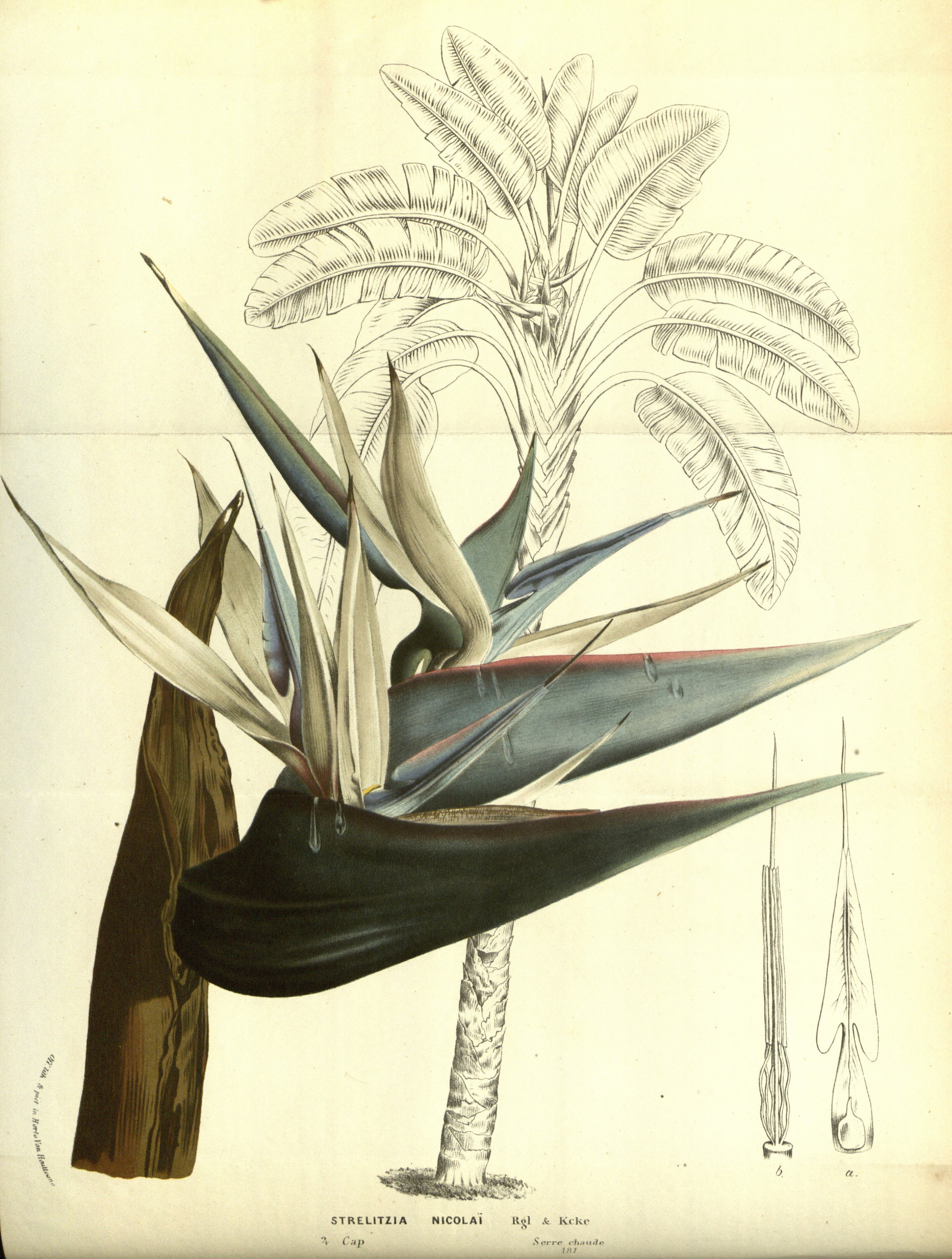 Description: Large banana-like leaves in fan arrangement, forming multiple trunks over time.