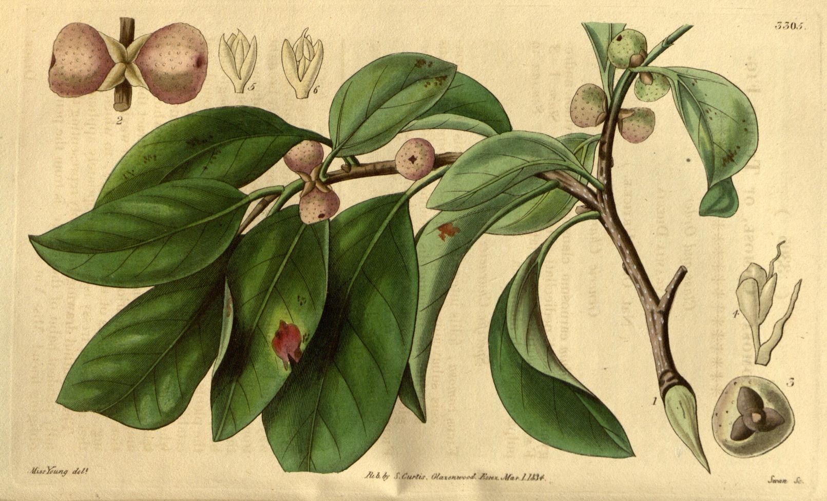 Description: Tropical tree with fragrant flowers and smooth pointed leaves. Drops leaves in winter.