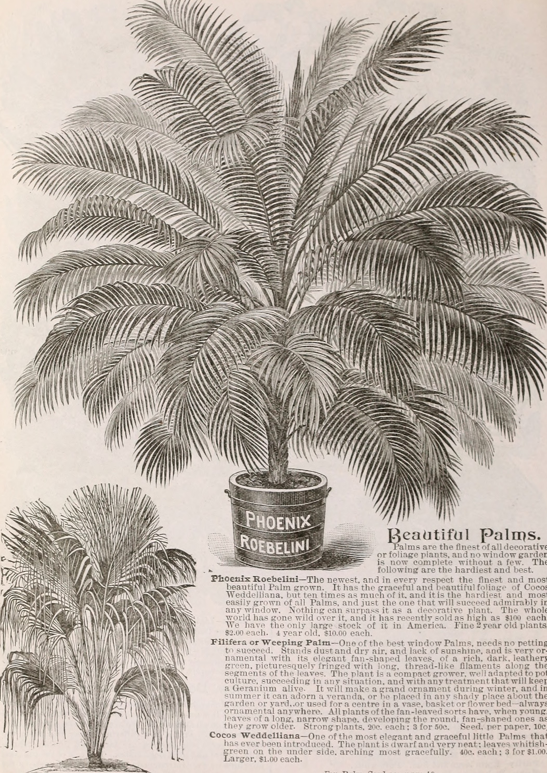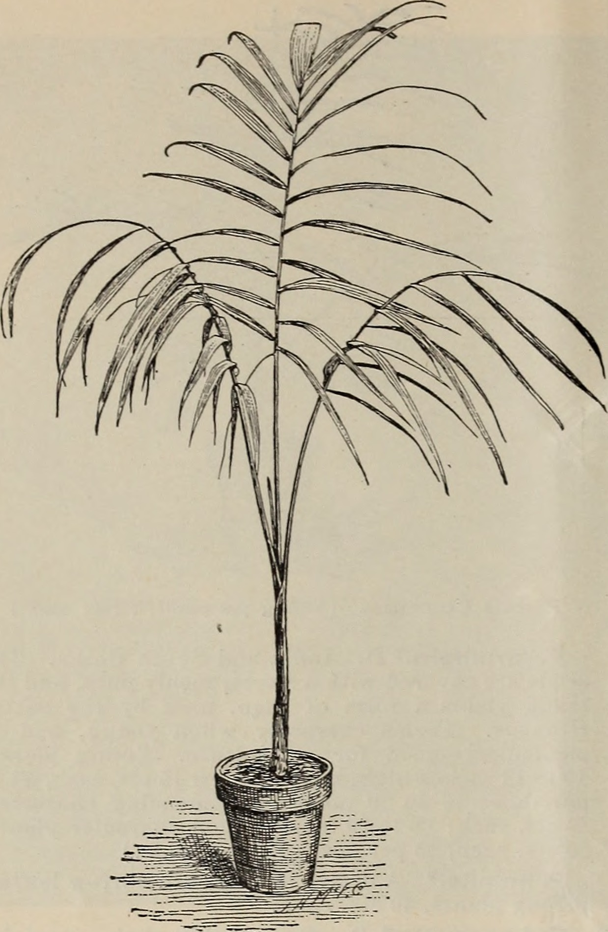 Description: Compact palm with graceful arching fronds and narrow leaflets. Both potted and ground specimens present.