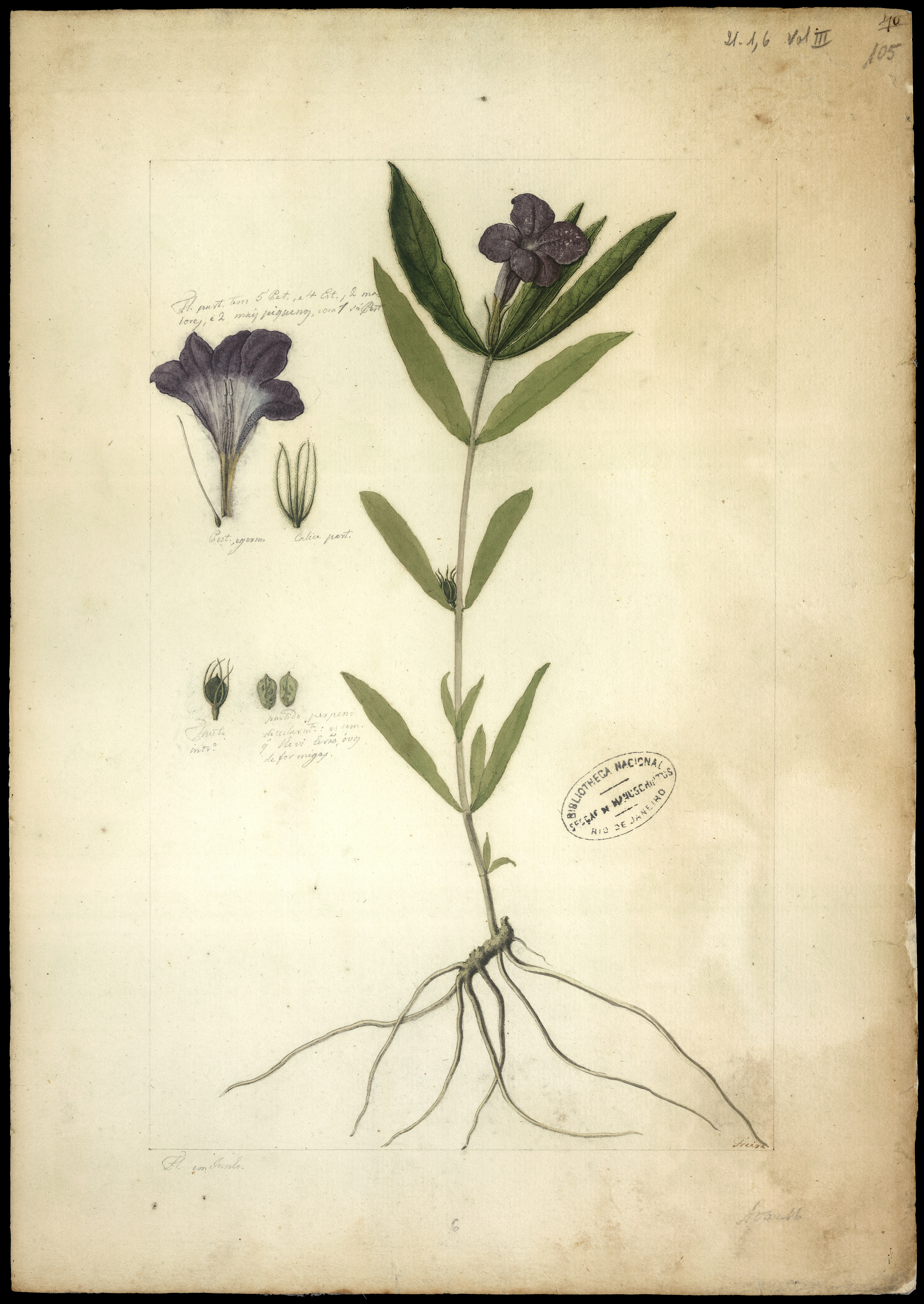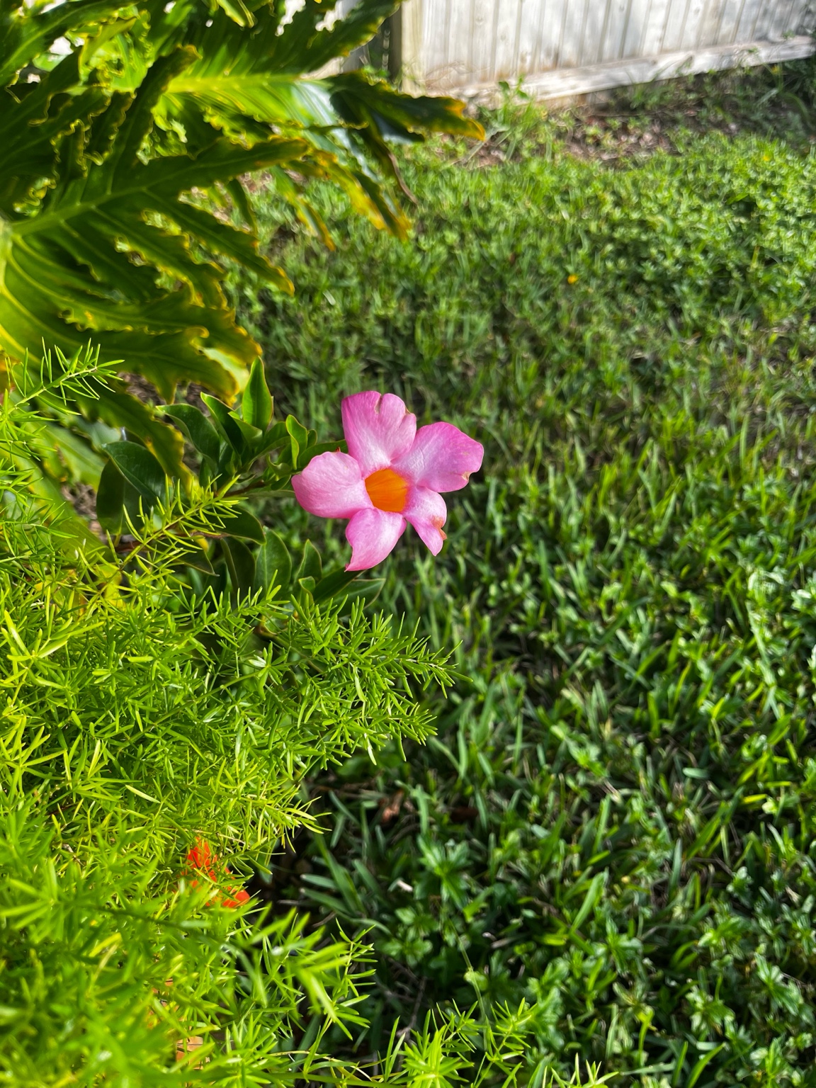 Description: Bright purple trumpet-shaped flowers scattered throughout wild corner area. Grows alongside volunteer native species including Spanish Needles (Bidens alba), purslane, and native grasses.