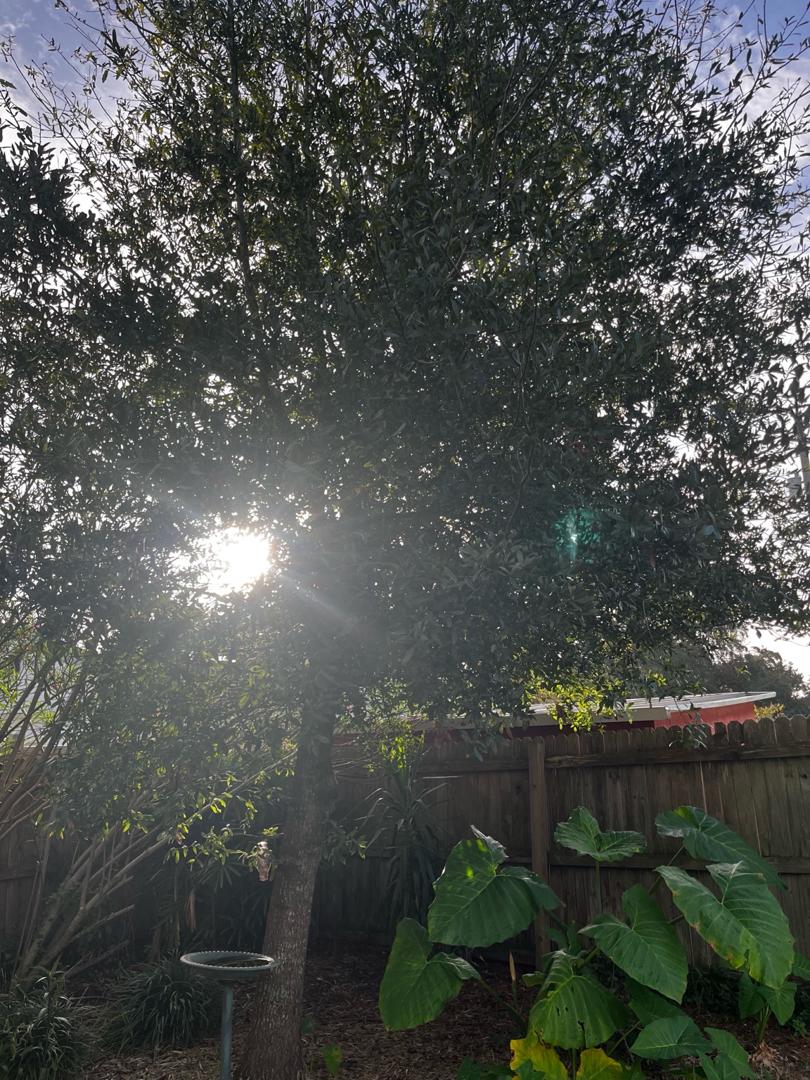 Description: Mature centerpiece tree with broad, spreading canopy providing excellent shade. Small oval evergreen leaves with gray-brown furrowed bark.