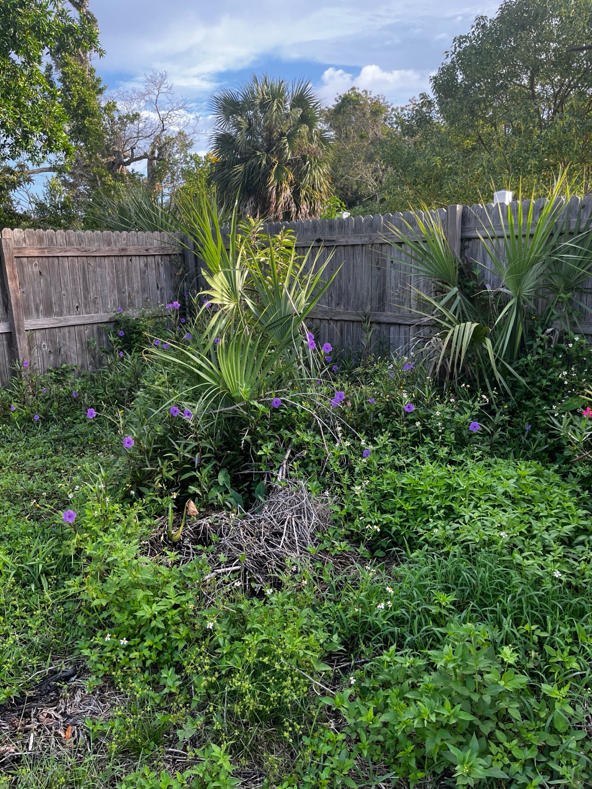 Description: Native fan palms with stiff fronds along fence line. Mix of low-growing saw palmetto and potential cabbage palm trees.